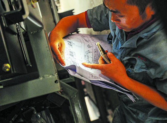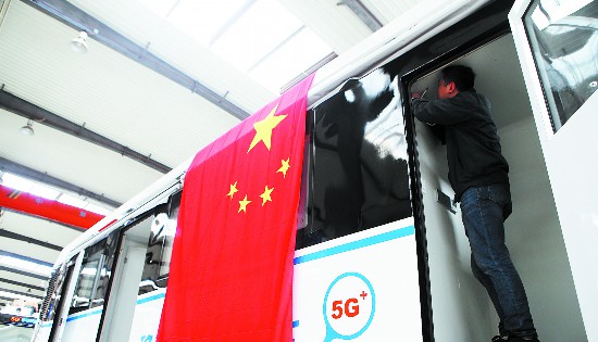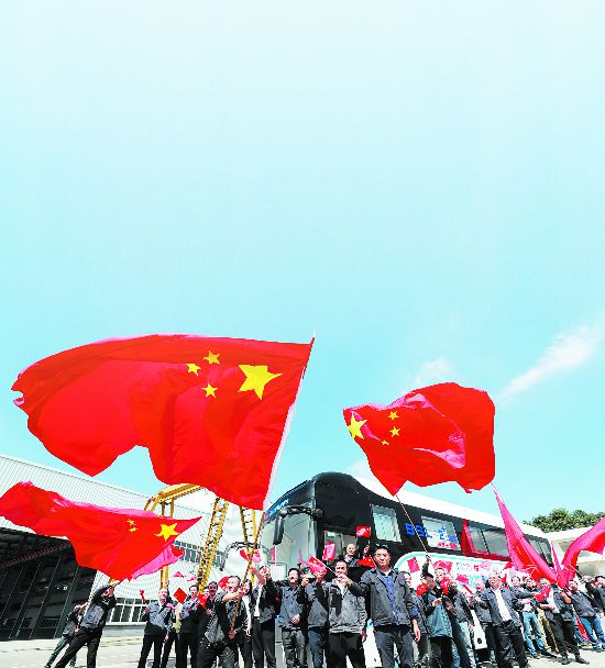 工程技术人员将一面国旗挂于正在生产的车身上,以此激励大家奋战