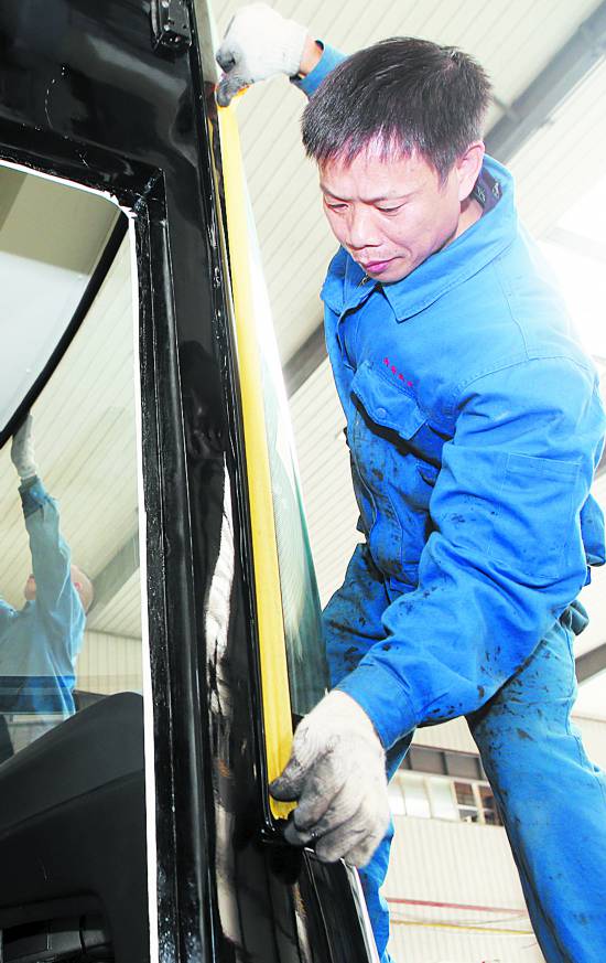 经验丰富的工人师傅正在安装车辆前风挡玻璃