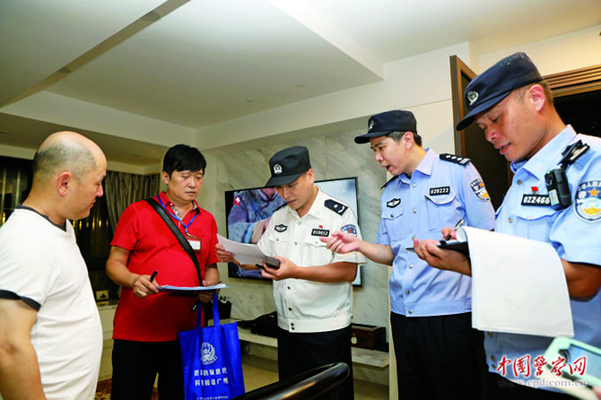 李世全(中)和民警入户走访。(广州市公安局提供)