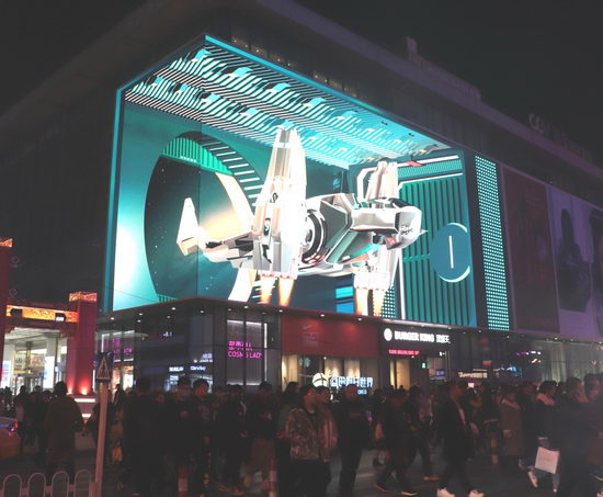“现在大家所看到的场景,是我们不佩戴3D眼镜就可以看到真实的3D效果,也就是俗称的裸眼3D,其实它背后的技术是相当复杂的。”据该项目的技术人员介绍,“这个是目前世界上最流行的3D动画技术结合这种特殊的LED屏的硬件,它创造了一种虚拟的3D效果,从技术角度来讲,是目前最流行的,也是未来户外大屏显示的一种新趋势。”