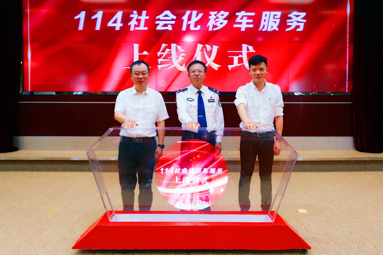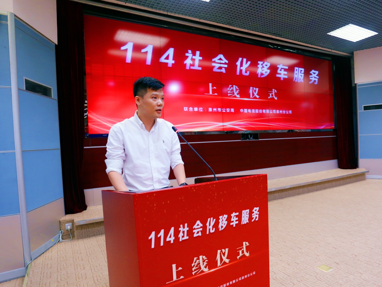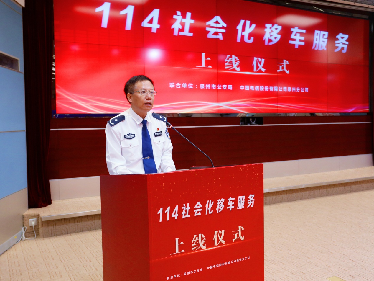 中国网讯 11月27日上午,泉州市公安局联合中国电信泉州分公司在市刺桐路电信大厦举行“114社会化移车”上线仪式。泉州市公安局党委委员、副局长曾志敏和中国电信泉州分公司党委委员、副总经理彭锦图、张英力出席活动,共同宣布“泉州114社会化移车服务”正式上线。