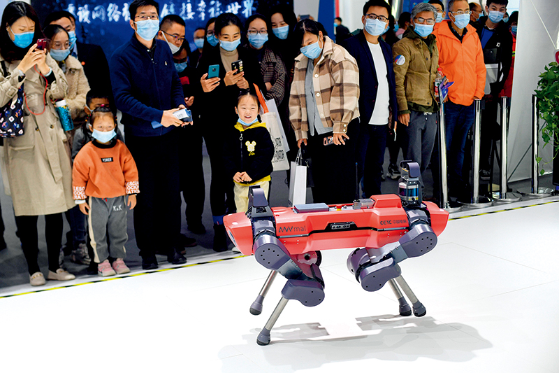 11 月22 日,观众在2020 年世界互联网大会“互联网之光”博览会上观看四足机器人 黄宗治摄/本刊