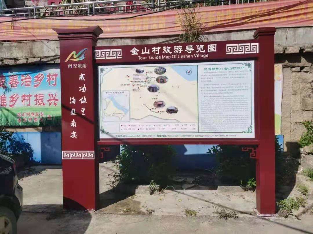 在金山村,新安装的道路导览标识系统包括导览图、宣传栏、道路分流标识、景点介绍等,每种标识标牌上都有南安市城市品牌形象标识。在中、英两种文字标注的导览图上,游客不仅能清楚地了解自己当前所处的位置,问询处(如游客中心或村委会)、停车场、公交站、公共厕所、餐饮店、特产店(购物店)、村内各景点以及游客咨询、投诉、救援电话等也都一目了然。