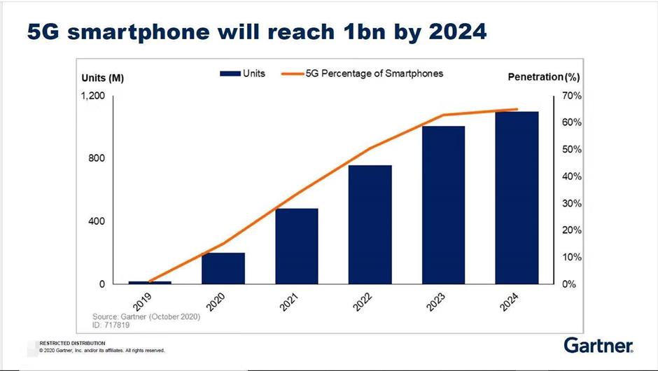 Gartner称,明年售出的智能手机中,约35%将是5G机型,到2024年,5G市场份额将飙升至60%。
