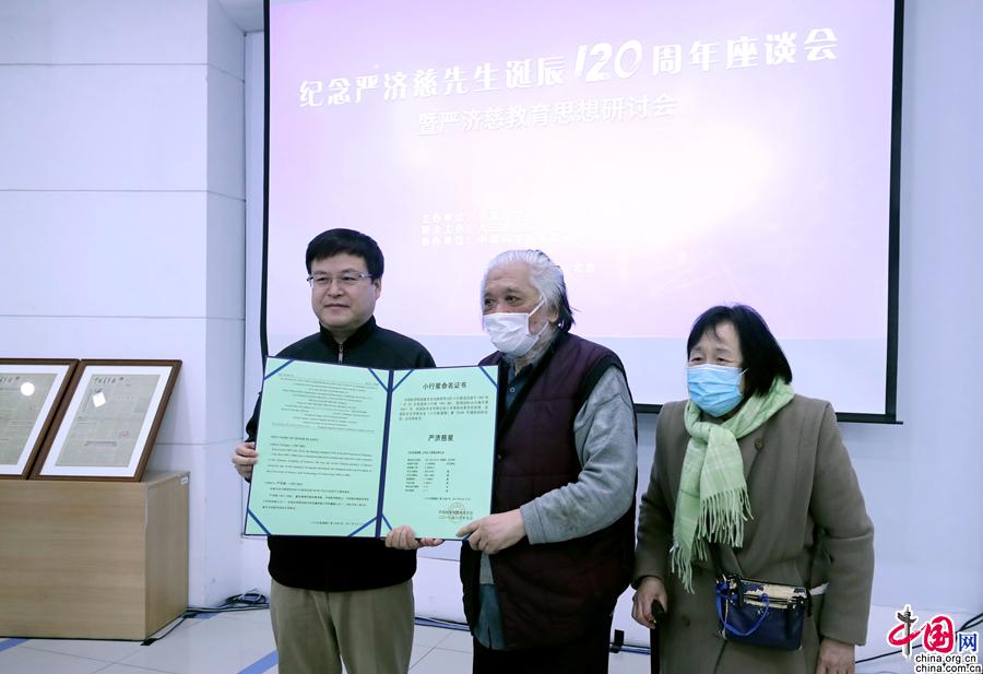 严陆光(中)代表家人,将“严济慈星”小行星命名证书捐赠给国科大(杨天鹏 摄)