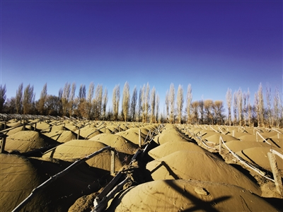 据介绍,阳关林场原有高大乔木枯枝落叶腐殖后,有机质多年聚集,促进了细沙成土,改变了沙地性质,使得流沙趋向固定。而在当地种植葡萄,枝干需埋土防寒,秋冬埋土、春季出土要进行两次土壤大翻动,人力作用使得地表沙质疏松,形成流动沙土。从当年11月到翌年4月,葡萄园地表土裸露时间长达半年,而冬春季节大风天气频繁,不仅人为制造了大面积沙尘源,还加剧了林地土壤风蚀。