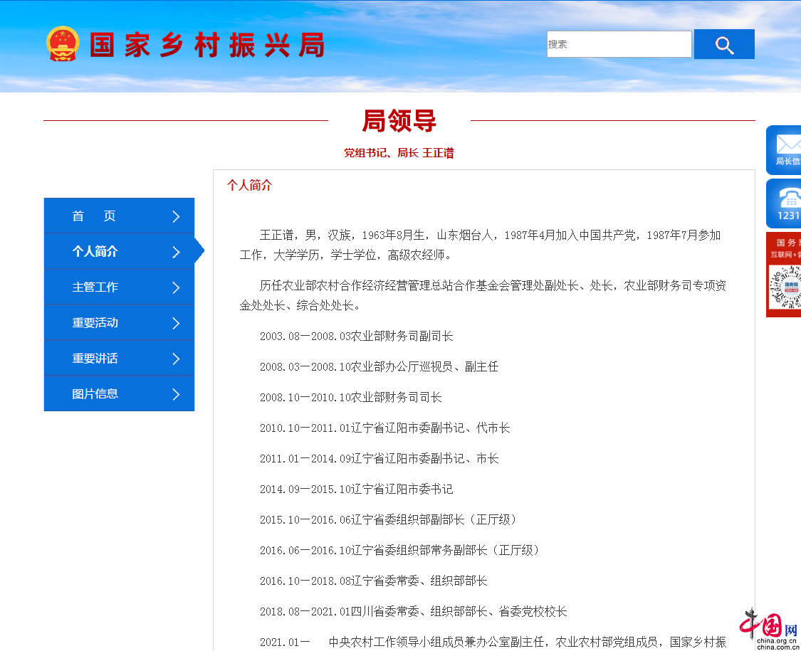 中国网记者今天下午在国务院扶贫开发领导小组办公室官网检索获悉,四川省委常委、组织部部长、省委党校校长王正谱已出任国家乡村振兴局党组书记、局长。