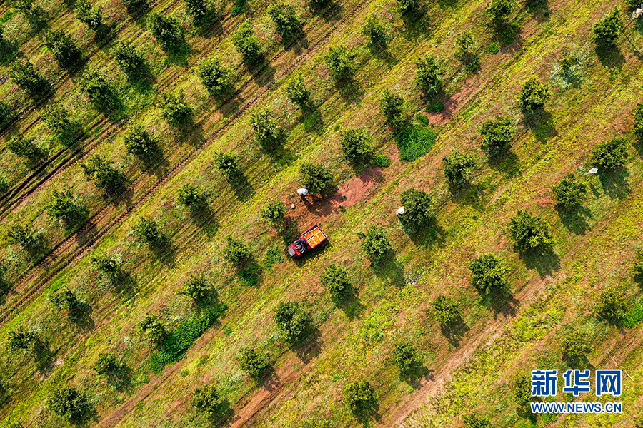 3月4日,在渝北区大盛镇青龙村的现代化果园内,村民驾驶小型农机运送采摘的鲜果(无人机照片)。新华社记者 刘潺 摄