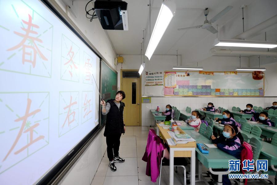 3月11日,石家庄市桥西区裕华西路小学参加课后托管的学生在上书法课。