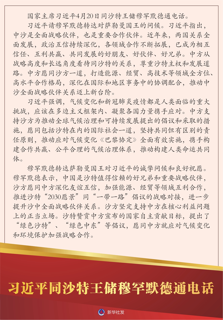 国家主席习近平4月20日同沙特王储穆罕默德通电话。