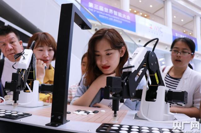 第三届世界智能大会上观众在与机器人进行五子棋对决(央广网记者刘阳 摄)