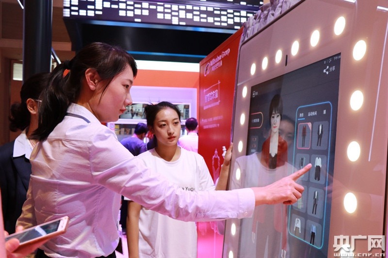 第二届世界智能大会观众体验智能试衣镜(央广网记者褚夫晴 摄)