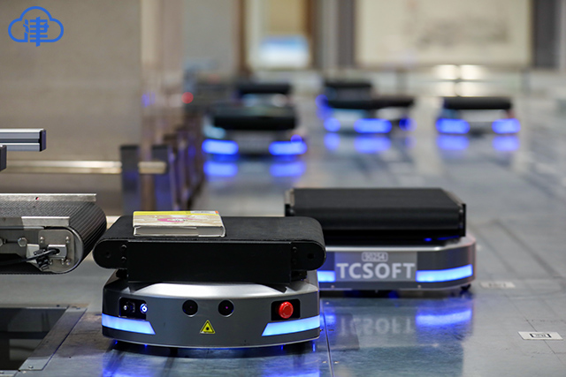 除此外中新友好图书馆还全新投用了智能分拣还书系统,由15个分拣机器人和2个搬运机器人组成。读者还书成功后,分拣机器人会根据后台智能调度系统指示,沿着最优路径前往分拣格口,完成图书分类,并能做到在途中互相避让、自动避障。当格口内的图书装满后,搬运机器人会立即将图书搬出,并实时通知工作人员处理。