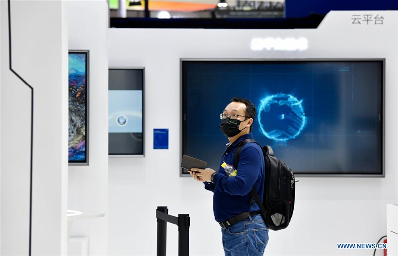 A visitor views the exhibits at the World Intelligence Congress in Tianjin, north China, May 20, 2021. The fifth World Intelligence Congress, a major artificial intelligence (AI) event in China, kicked off on Thursday, highlighting frontier AI technologies and applications. [Photo by Zhao Zishuo/Xinhua]