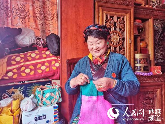 央金正在织毛衣,阳光洒在她的脸上。人民网 李海霞摄