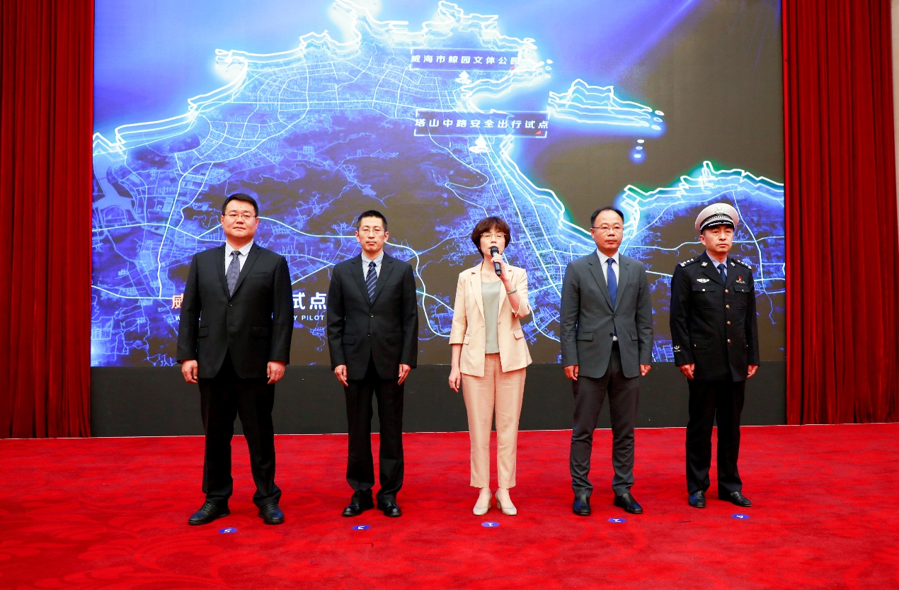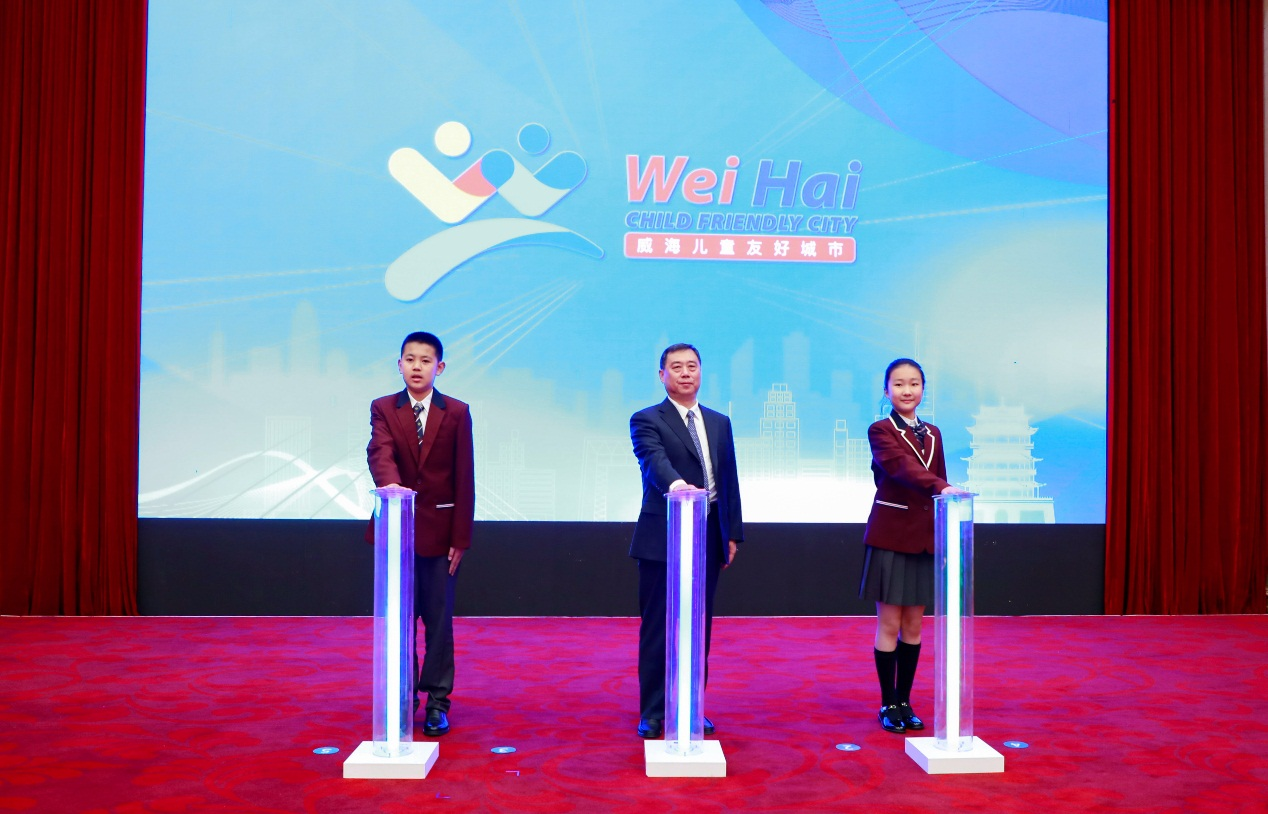 威海市政府副市长、市妇儿工委主任叶立耘和儿童代表发布威海儿童友好城市LOGO