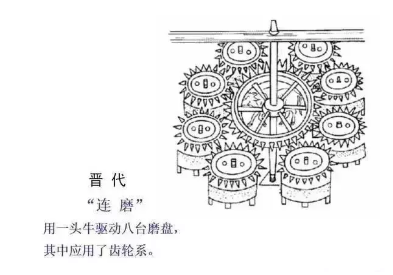 从中世纪欧洲用脚踏板驱动的加工木棒的车床,利用曲轴做成的研磨机。到东汉利用水利炼铁的水排,利用一头牛可驱动8台磨盘的晋代连磨等。