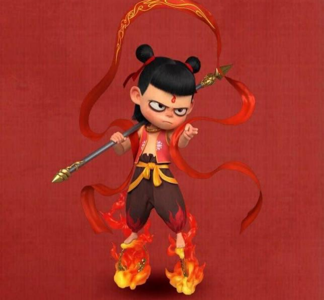像哪吒服饰的色彩充斥着大量的红色,大红的肚兜,火红的混天绫,和头顶鲜红的束发带,既有微小的差别,又统一于整体色调当中,寓意着正义和勇敢,符合哪吒正直、果敢的性格特点。