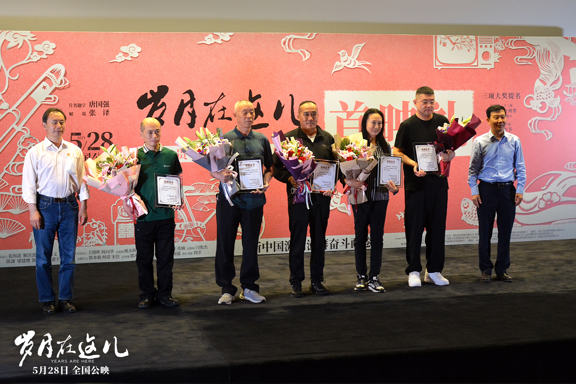 活动现场中央新影集团总经理姚永晖,新京报社长刘军胜,发表震感奋进的致辞。出品方代表还向特邀到场的劳动模范:全国劳模红旗渠建设者张买江,北京市劳动模范,张秉贵的徒弟王国忠,时传祥亲属时亮,五一劳动奖章获得者袁淑梅,全国治沙楷模张喜旺,及摄制组主创,颁发了电影《岁月在这儿》同名纪念版荣誉证书。到场的出品方及各方嘉宾畅谈电影感言,为影片启动首映礼,预祝影片取得票房口碑双丰收。父辈先烈经历的艰苦奋斗岁月,也是最让人心潮澎湃的年代。