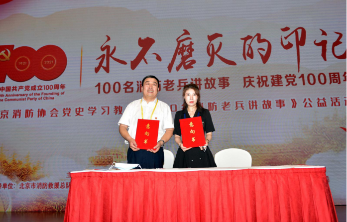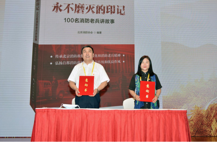 北京消防协会孙富会长与中国旅游出版社副主编段向民同志签署《100名消防老兵讲故事》纪实性图书出版意向书