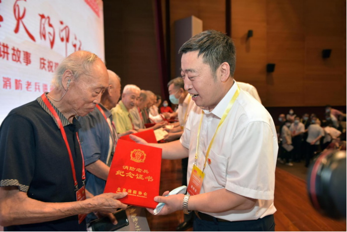 北京消防协会孙富会长向消防老兵颁发纪念证书