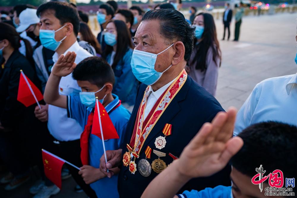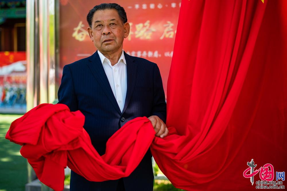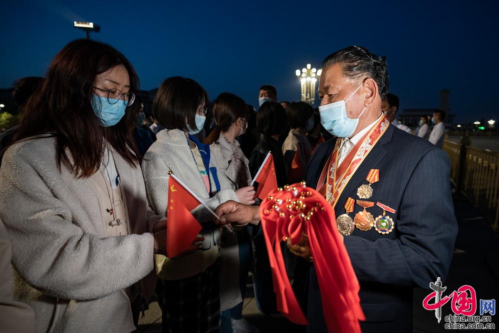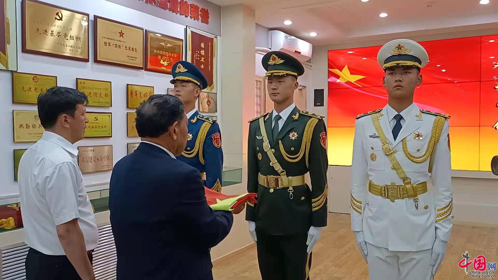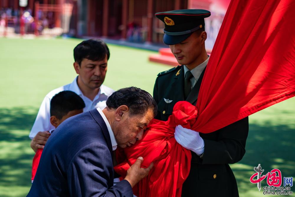 参观结束后,解放军仪仗大队国旗护卫队举行简短庄重的国旗交接仪式,沙勒克江·依明将一面亲手升起的国旗交给了国旗护卫队的战士。今年是建党100周年,这面国旗是年初他在小院里升起的第一面国旗,有特殊的纪念意义。受访者 供图