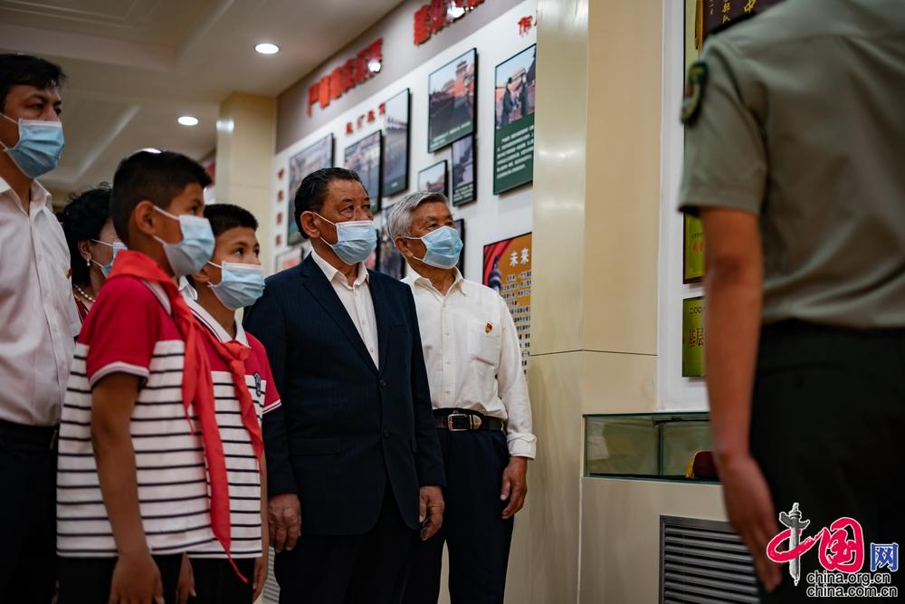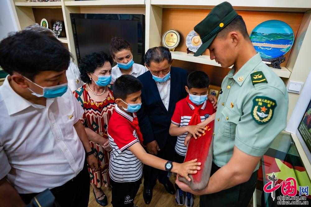 在解放军仪仗大队国旗护卫队的荣誉室里,沙大叔抚摸着新疆军区河尾滩边防连官兵制作的“石头国旗”,激动的告诉两个孙子,“这是喀喇昆仑山上海拔5418米的石头,你们长大了要像解放军叔叔一样,戍守边关、保家卫国”。中国网记者 郑亮摄