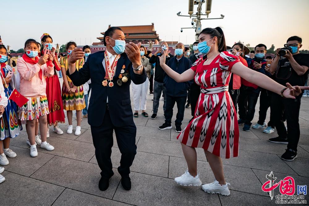 升旗仪式结束,沙勒克江·依明难掩激动,他邀请人群中一位身着维吾尔族传统服饰的年轻姑娘,跳起欢快的民族舞蹈,赢得阵阵热烈掌声。人们不约而同地高声呼喊:“祖国万岁!”“共产党万岁!”中国网记者 郑亮摄