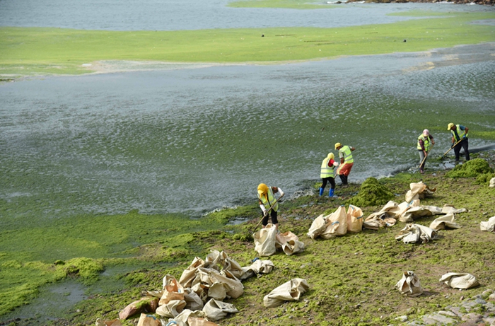 7月6日,工人在清理浒苔。新华社记者王凯 摄