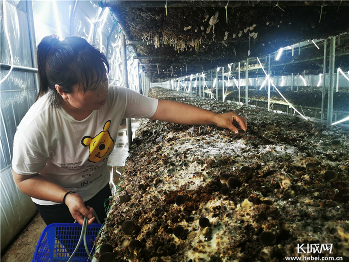 后南阳堡村村民赵改燕在菌菇大棚采摘草菇。长城网记者 孙学工 摄