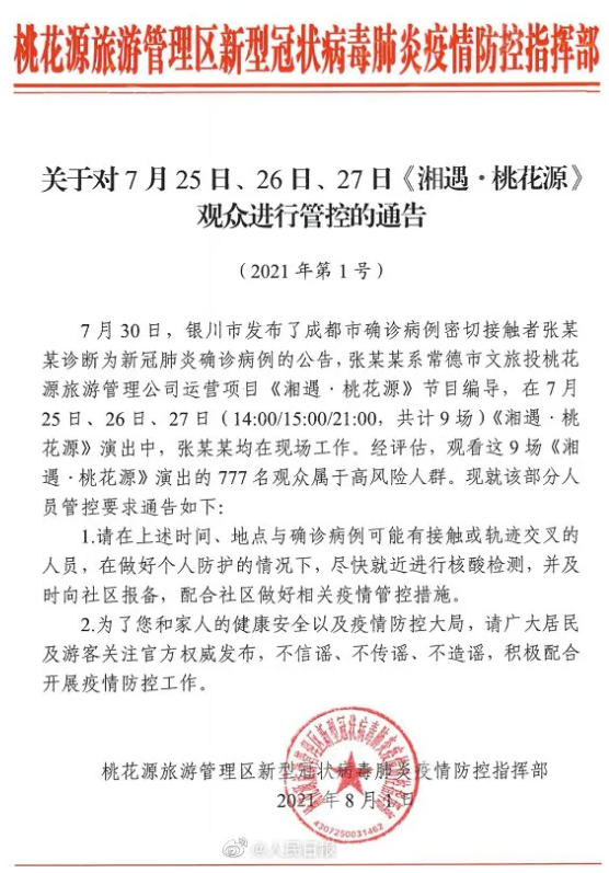 8月1日,湖南常德桃花源旅游管理区疫情防控指挥部发布公告:7月30日,银川市发布了成都市确诊病例密切接触者张某某诊断为确诊病例的公告,张某某系常德市文旅投桃花源旅游管理公司运营项目《湘遇·桃花源》节目编导,在7月25日、26日、27日(14:00/15:00/21:00,共计9场)《湘遇·桃花源》演出中,张某某均在现场工作。