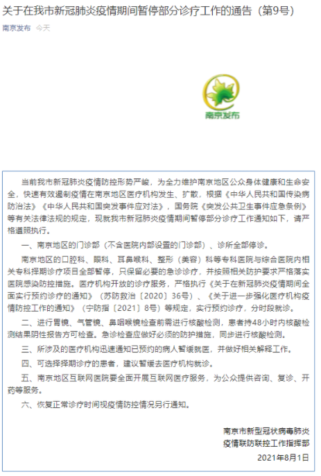 南京地区的口腔科、眼科、耳鼻喉科、整形(美容)科等专科医院与综合医院内相关专科择期诊疗项目全部暂停,只保留必要的急诊诊疗,并按照相关防护要求严格落实医院感染防控措施。医疗机构开放的诊疗服务,严格执行《关于在新冠肺炎疫情期间全面实行预约诊疗的通知》(苏防救治〔2020〕36号)、《关于进一步强化医疗机构疫情防控工作的通知》(宁防指〔2021〕8号)等规定,实行预约诊疗,分时段就诊。