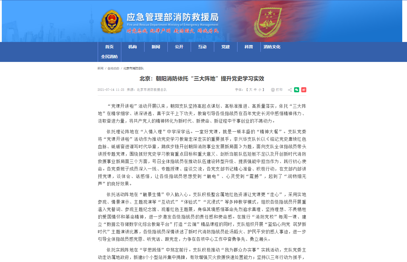 北京市朝阳区消防救援支队把深学笃行习近平总书记“七一”重要讲话精神作为首要政治任务,通过“点上着力、线上延伸、面上拓展”三大举措,全面掀起学习热潮。
