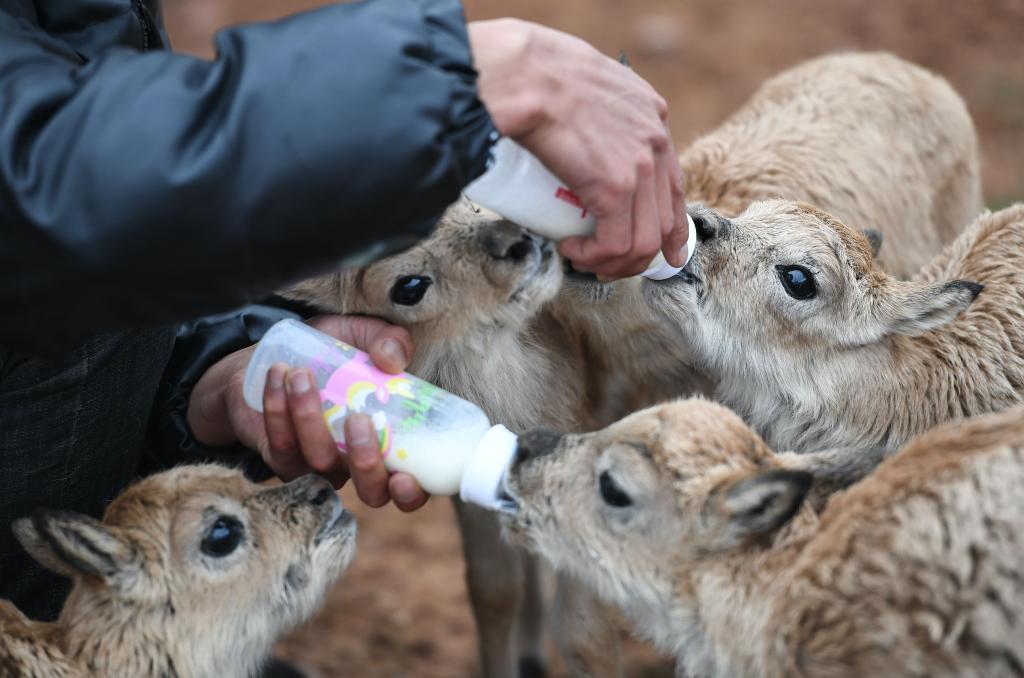 2020年7月7日,三江源国家公园管理局长江源园区可可西里管理处卓乃湖保护站的工作人员才文多杰在给藏羚羊幼仔喂奶。新华社记者薛玉斌 摄
