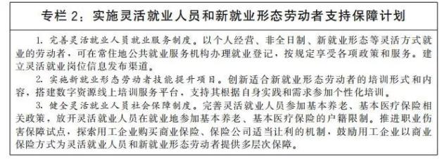 支持多渠道灵活就业和新就业形态发展。破除各种不合理限制,建立促进多渠道灵活就业机制,支持和规范发展新就业形态。鼓励传统行业跨界融合、业态创新,增加灵活就业和新就业形态就业机会。加快落实《关于维护新就业形态劳动者劳动保障权益的指导意见》,建立完善适应灵活就业和新就业形态的劳动权益保障制度,引导支持灵活就业人员和新就业形态劳动者参加社会保险,提高灵活就业人员和新就业形态劳动者社会保障水平。规范平台企业用工,明确平台企业劳动保护责任。健全职业分类动态调整机制,持续开发新职业,发布新职业标准。
