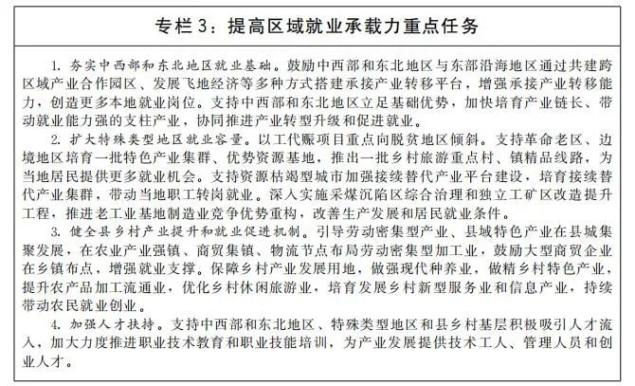推动区域就业协调发展。支持东部地区发挥创新要素集聚优势,率先实现产业升级,开拓高质量就业新领域,培育高质量就业增长极。加快完善中西部和东北地区基础设施,提升产业集聚区公共服务效能,引导产业向中西部和东北地区有序梯度转移,推动就业机会向中西部和东北地区扩散。支持中西部和东北地区根据国家战略导向和发展重点,对接先进生产要素和创新资源,发展特色优势产业,改造提升传统产业,积极布局新兴产业,厚植就业创业沃土。