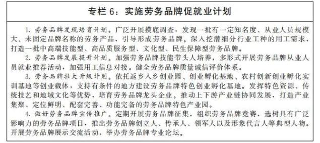 稳定和扩大农村劳动力外出就业规模。广泛开展区域间劳务协作,健全劳务输入集中区域与劳务输出省份对接协调机制,加强劳动力跨区域精准对接,发展劳务组织和经纪人,有序组织输出地农村劳动力外出务工。培育一批有地域特色、行业特征、技能特点,带动农村劳动力就业效果好的劳务品牌。实施农民工素质提升工程,推进新生代农民工职业技能提升计划。创建一批农村劳动力转移就业示范县。