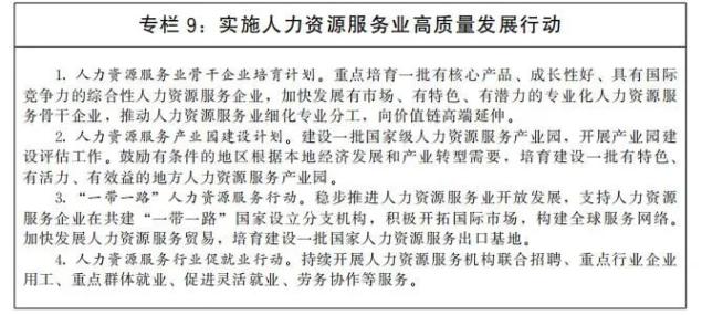加快人力资源服务业高质量发展。推动人力资源服务与实体经济融合发展,引导人力资源服务机构围绕产业基础高级化、产业链现代化提供精准专业服务。鼓励人力资源服务业管理创新、技术创新、服务创新和产品创新,大力发展人力资源管理咨询、高级人才寻访、人才测评等高技术、高附加值业态。实施人力资源服务业领军人才培养计划。开展“互联网+人力资源服务”行动。深化人力资源服务领域对外开放,探索建设国家人力资源服务出口基地。