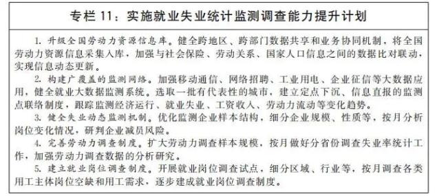 完善就业失业统计监测调查体系。加快构建系统完备、立体化的就业失业监测网络,实现劳动力市场、企业用工主体和劳动者个体全覆盖,全面反映就业增长、失业水平、市场供求状况。完善就业统计指标体系和调查统计方法,探索进行就业质量、就业稳定性等方面的分析。推进大数据在就业统计监测领域的应用。