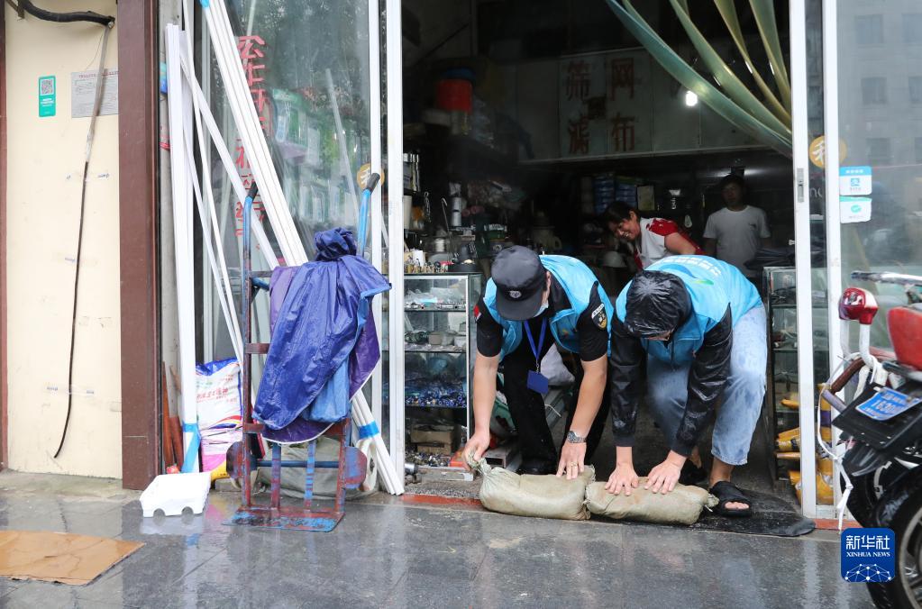 9月13日,上海市黄浦区外滩街道山北居委会工作人员为辖区沿街商铺码好防汛沙袋。