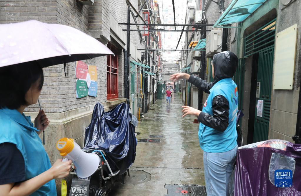 9月13日,上海市黄浦区外滩街道山北居委会工作人员在社区巡视,提醒居民注意安全。