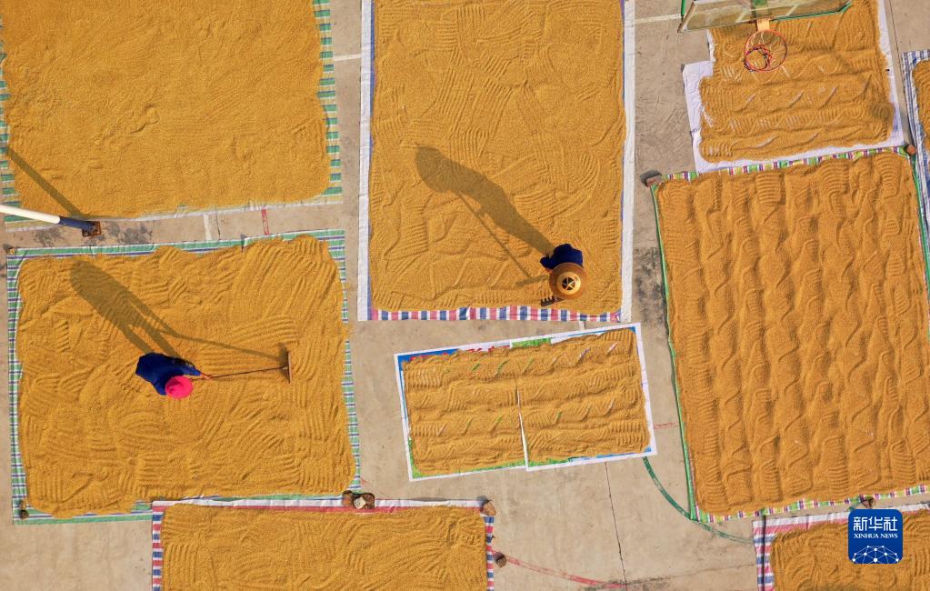 9月14日,在三江侗族自治县同乐苗族乡高武村,村民晾晒稻谷(无人机照片)。