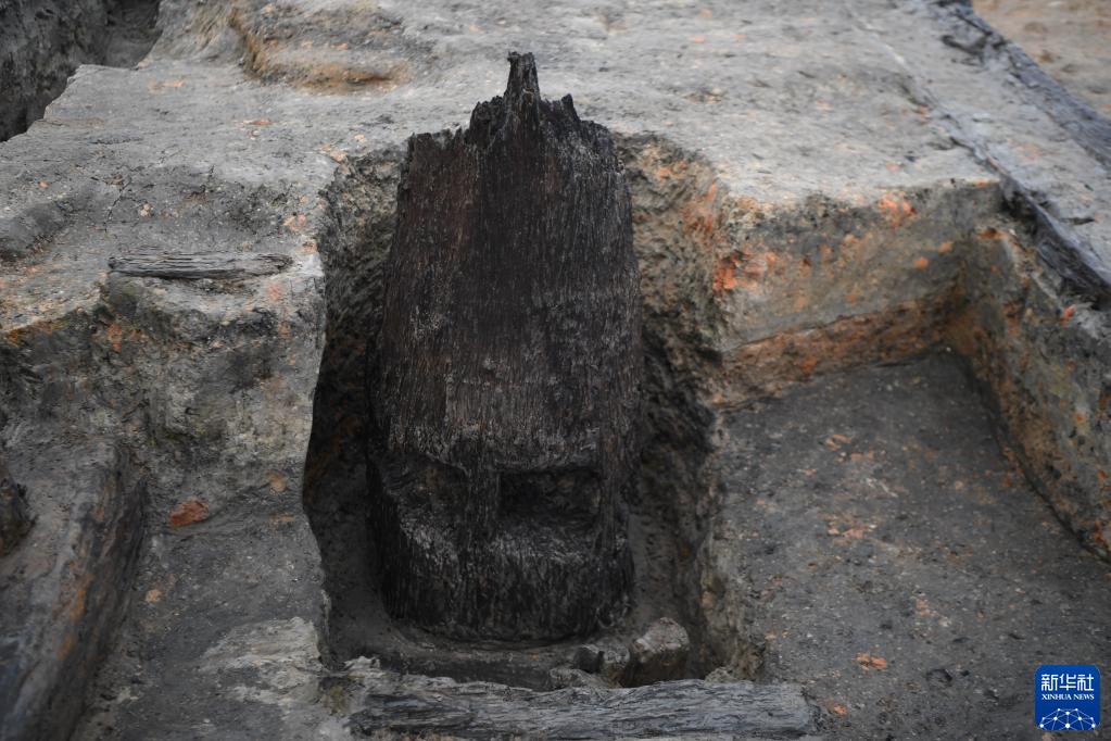 这是10月9日拍摄的湖南常德澧县鸡叫城遗址内的一根木柱。