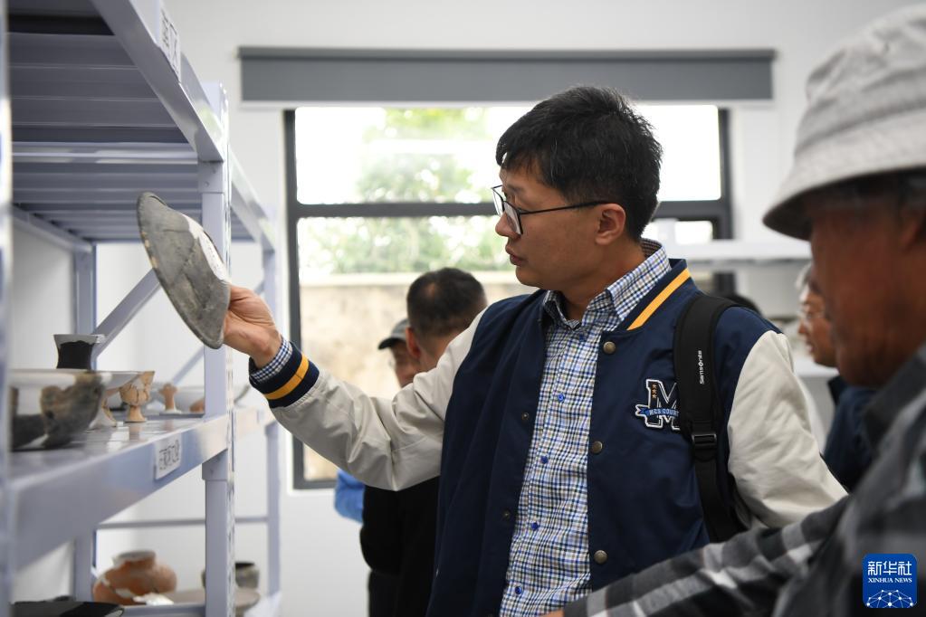 10月9日,几名专家在湖南常德澧县澧阳平原考古工作站查看鸡叫城遗址出土的陶器。