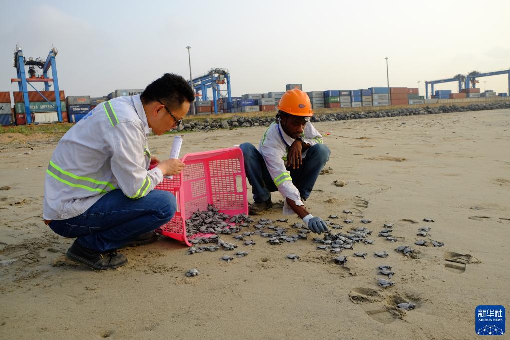 2018年2月7日,在中国港湾工程有限责任公司加纳特马港扩建工程项目宿舍区附近的沙滩上,工作人员将小海龟放在海滩上,让其自行爬回大海。企业在项目建设过程中格外注意对海龟生存环境进行监测,专门建立了一座“海龟孕育中心”,孵化放生了小海龟上万只。新华社记者 赵姝婷 摄