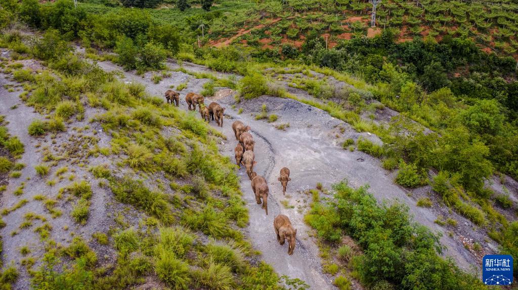 这是2021年8月9日在云南省玉溪市元江县境内拍摄的象群(无人机照片)。新华社记者 胡超 摄