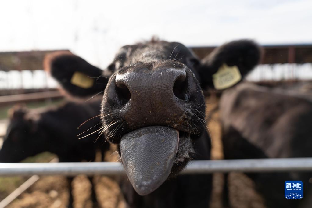 10月10日,在山东省临清市澳和牧业有限公司,一头“运河黑牛”朝着镜头吐舌头。