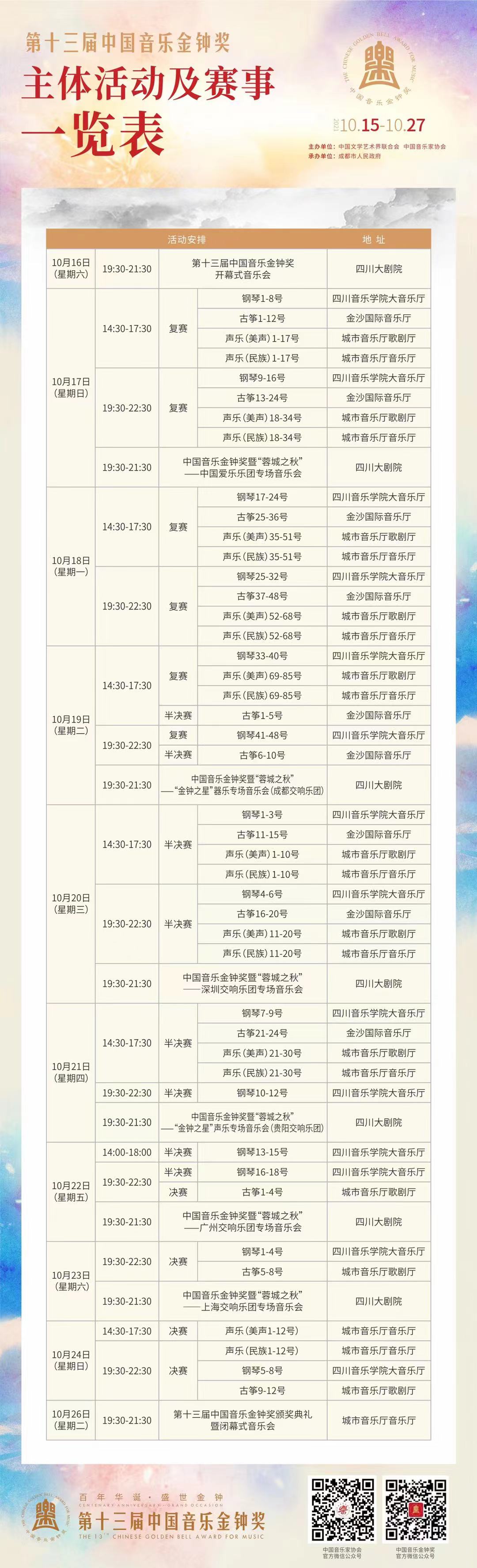 据主办方介绍,第十三届中国音乐金钟奖设钢琴、声乐(美声)、声乐(民族)、古筝四个项目的复赛、半决赛、决赛,共计44场高水准的音乐比赛。为充分展示评奖成果,本届中国音乐金钟奖与“蓉城之秋”成都国际音乐季联合推出中国爱乐乐团专场音乐会、“金钟之星”器乐专场音乐会(成都交响乐团)、深圳交响乐团专场音乐会、“金钟之星”声乐专场音乐会(贵阳交响乐团)、广州交响乐团专场音乐会、上海交响乐团专场音乐会等6台高水准的音乐会。(尤紫璇)