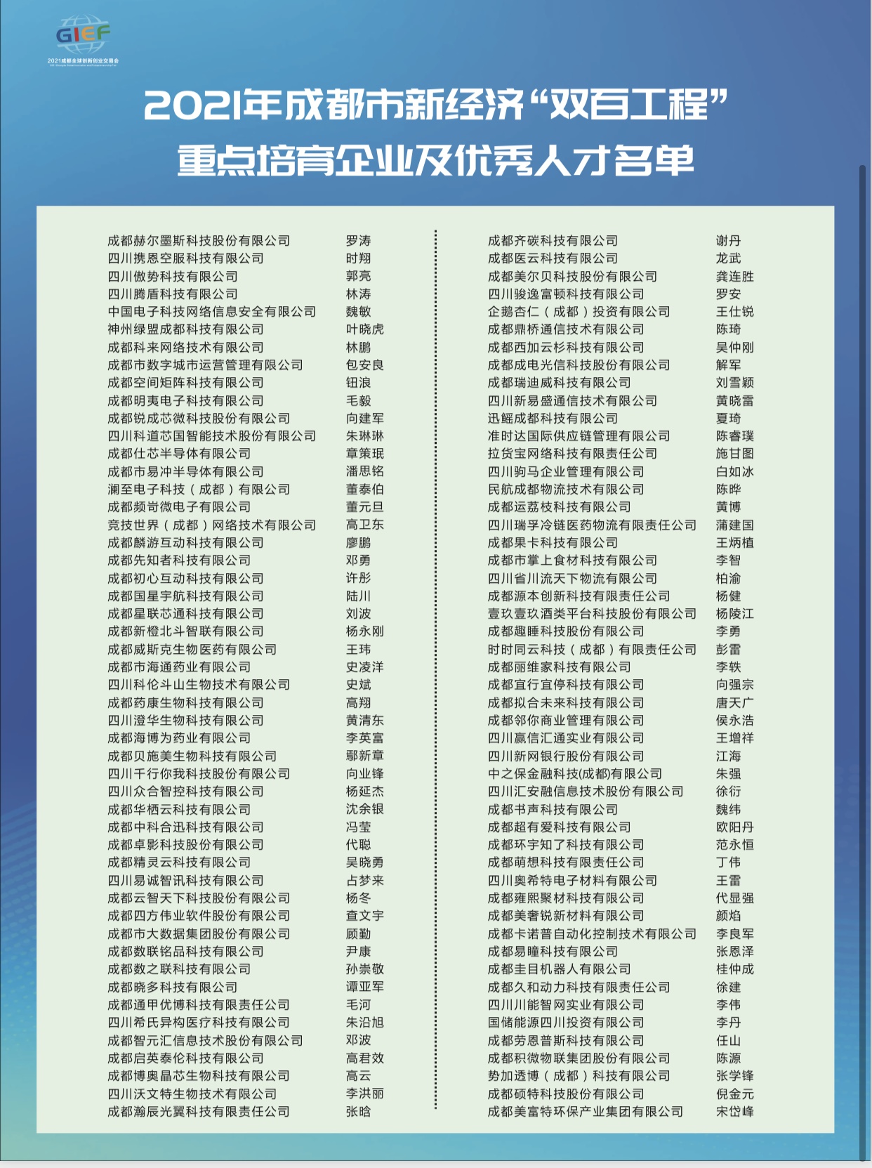 在本次“双千”“双百”发布会现场,重磅发布了2021年成都市新经济“双百工程”重点培育企业和优秀人才名单。据了解,今年的名单从724家新经济梯度企业中,综合考虑“赛道分布、区域分布”等因素,涉及到无人机、信息安全、集成电路、网络游戏等21个细分领域,最终遴选出100家新经济重点培育企业和100名优秀新经济人才。