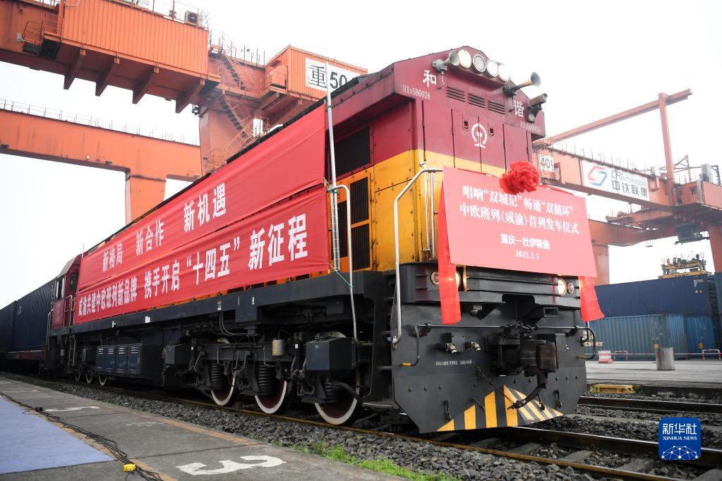 2021年1月1日,中欧班列(成渝)号首列班车在重庆团结村站等待发车。新华社记者 唐奕 摄